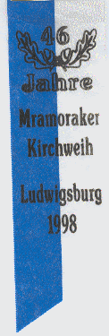 .... Mramoraker Kirchweihtreffen - in ........... Bemerkungen : Bilder zu dem Treffen (in Farbe) im Mramoraker Bote, Nr.3 / Jahrgang 8/ November 1998. Bei diesem Treffen erhält unser Pfarrer Jakob STEHLE eine echtes "Schwoweleiwle" - überreicht von Frau Elisabeth Welzel - "Schelke Lies":