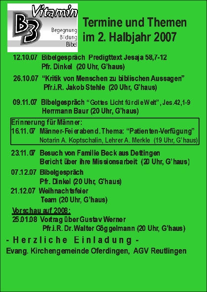 Verschiedene Texte Vitamin-B-3 : 2. Halbjahr 2007 Einladung zum Singspiel - Termine Fürbitte für die Kirchengemeinderäte Ansprache an die Kirchengemeinderäte Ergebnis der Kirchengemeinderatswahl