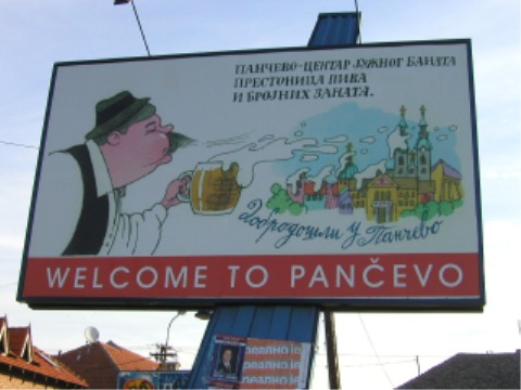Willkommensschild der Stadt Pancevo an einer der Haupteingangsstrassen nicht weit vom Hotel weg an der Tamesch.