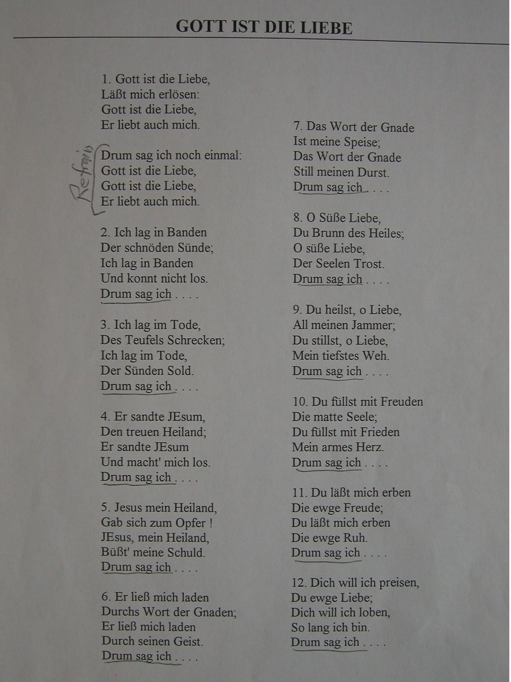"Gott ist die Liebe, lässt mich erlösen, Gott ist die Liebe, er liebt auch mich.