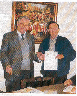 Zwei alte Kameraden freuen sich gemeinsam. Vorsitzender Baumung überreicht