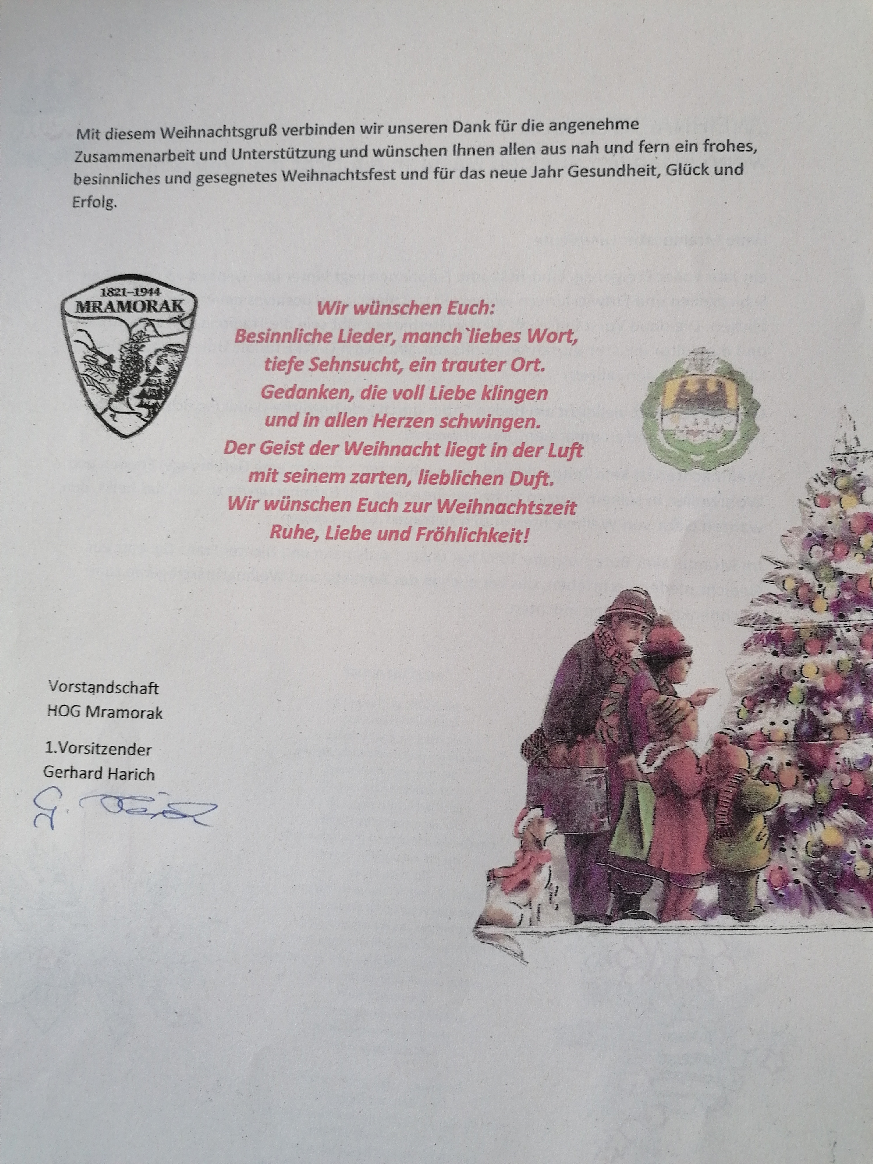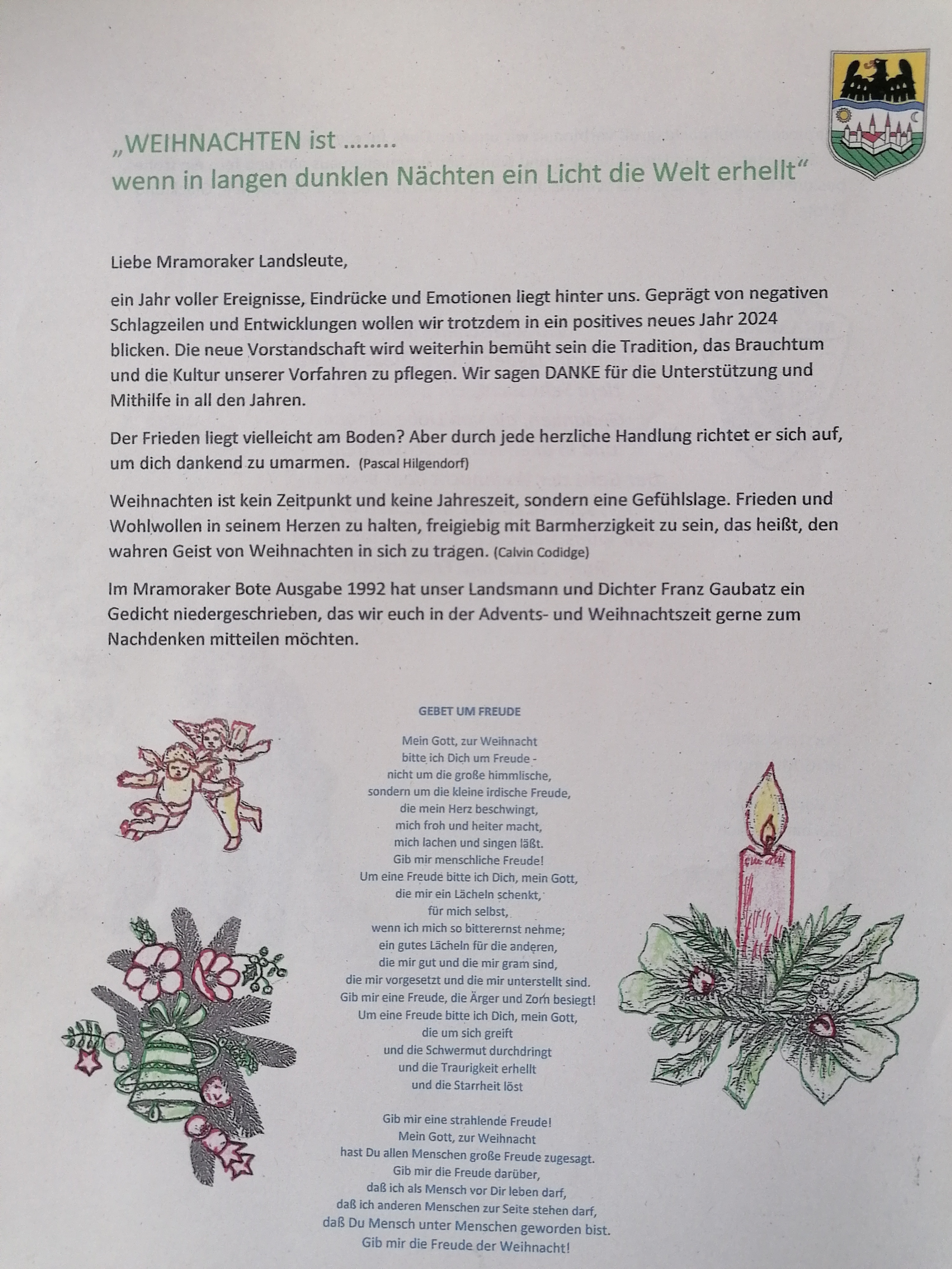 Allen unseren Mramoraker Landsleuten wünschen wir einen frohen und gesegneten 1. Adventssonntag. - Wir denken auch an unsere verstorbenen Landsleute und wünschen allen Leidtragenden Gottes Beistand und Trost.